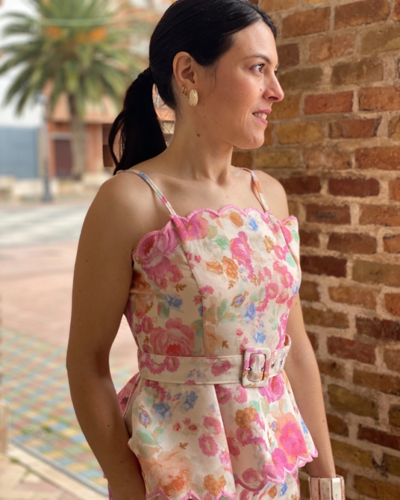 - Top con tirantes finos, escote recto con acabado ondulado y un volante en la cintura que crea un efecto peplum. Incluye cinturón del mismo tejido que marca la silueta.